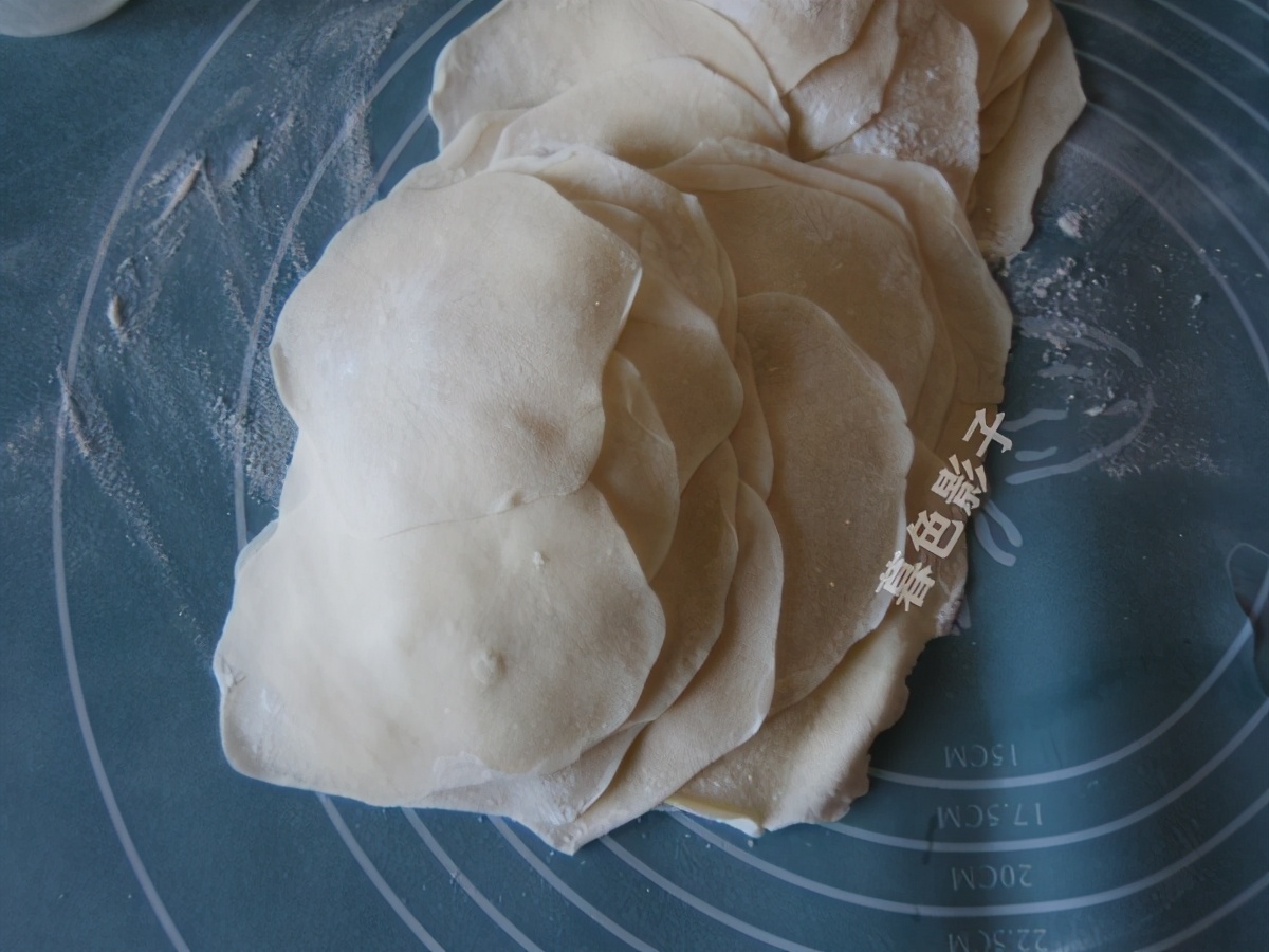 擀成薄的饺子面皮,擀皮的时候注意要加点干面粉,这样皮就不会粘连在一起了。