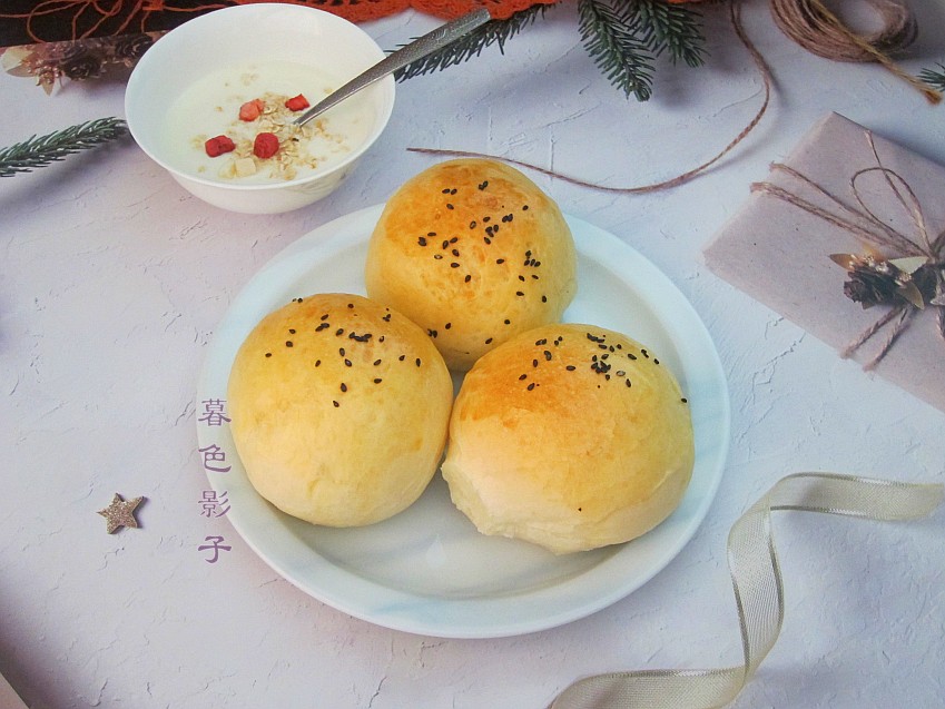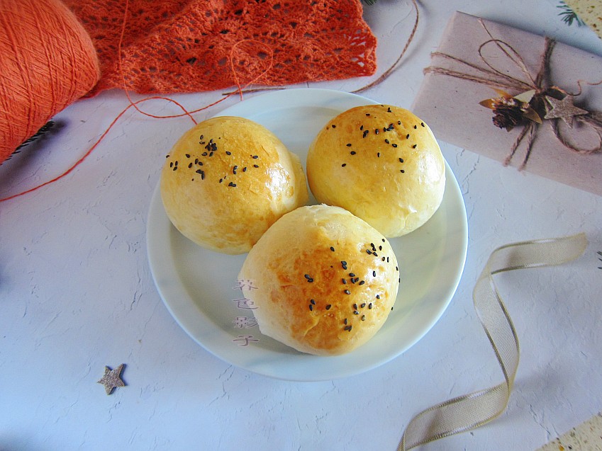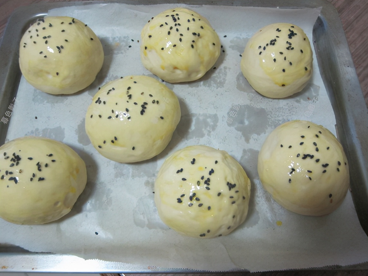 表面刷黄油,撒点芝麻做装饰,如果没有芝麻就刷鸡蛋液。先预热烤箱,然后烤箱上下火170度,时间25分钟。