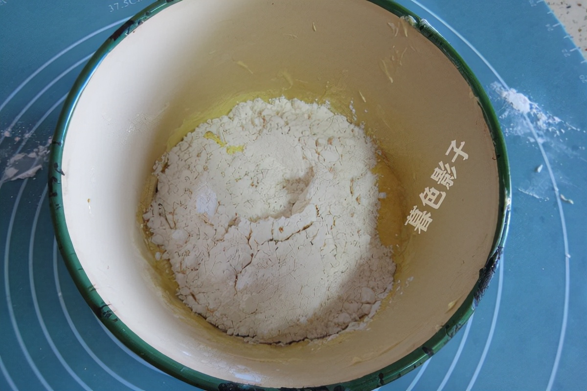 加蛋糕粉在搅打好的黄油鸡蛋液里边,搅拌到无干粉。