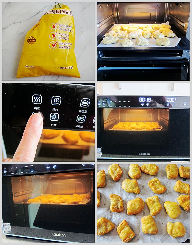 制作;冷冻的胡椒鸡块,直接装进铺油纸的空气炸烤箱烤盘,鸡块之间留有空隙。