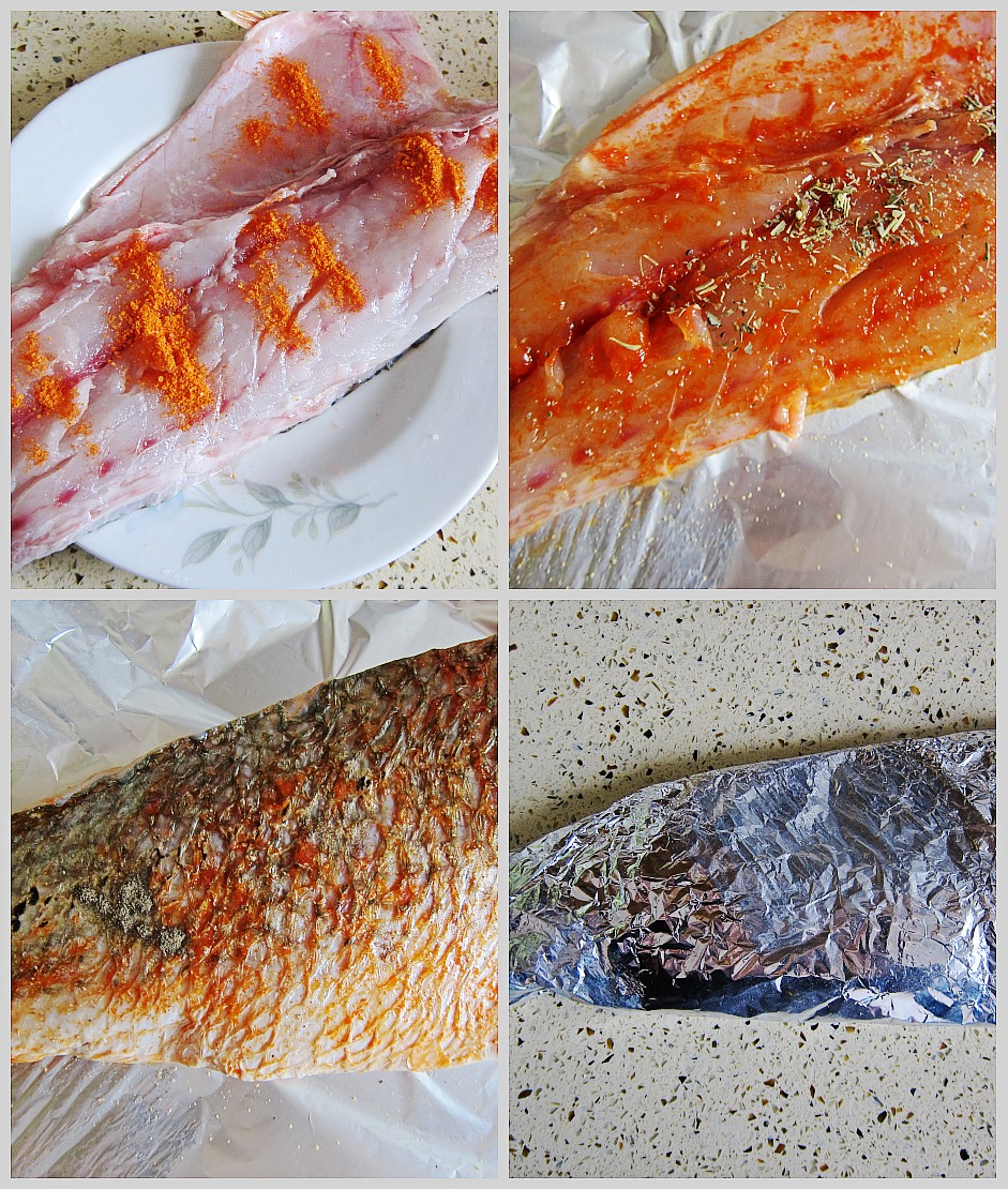 将黄花鱼清理干净内脏以及鱼鳞,去掉鱼头,把鱼从中间切开来。撒点盐轻轻地按下就能更好地吸收盐。把烤料刷在鱼肉上最好要均匀一点。