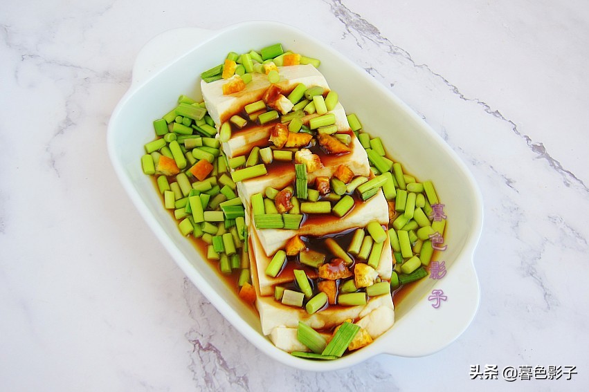 食材;水豆腐1块,青蒜苔少量,轻盐酱油2勺,照烧酱汁2勺,盐1勺。