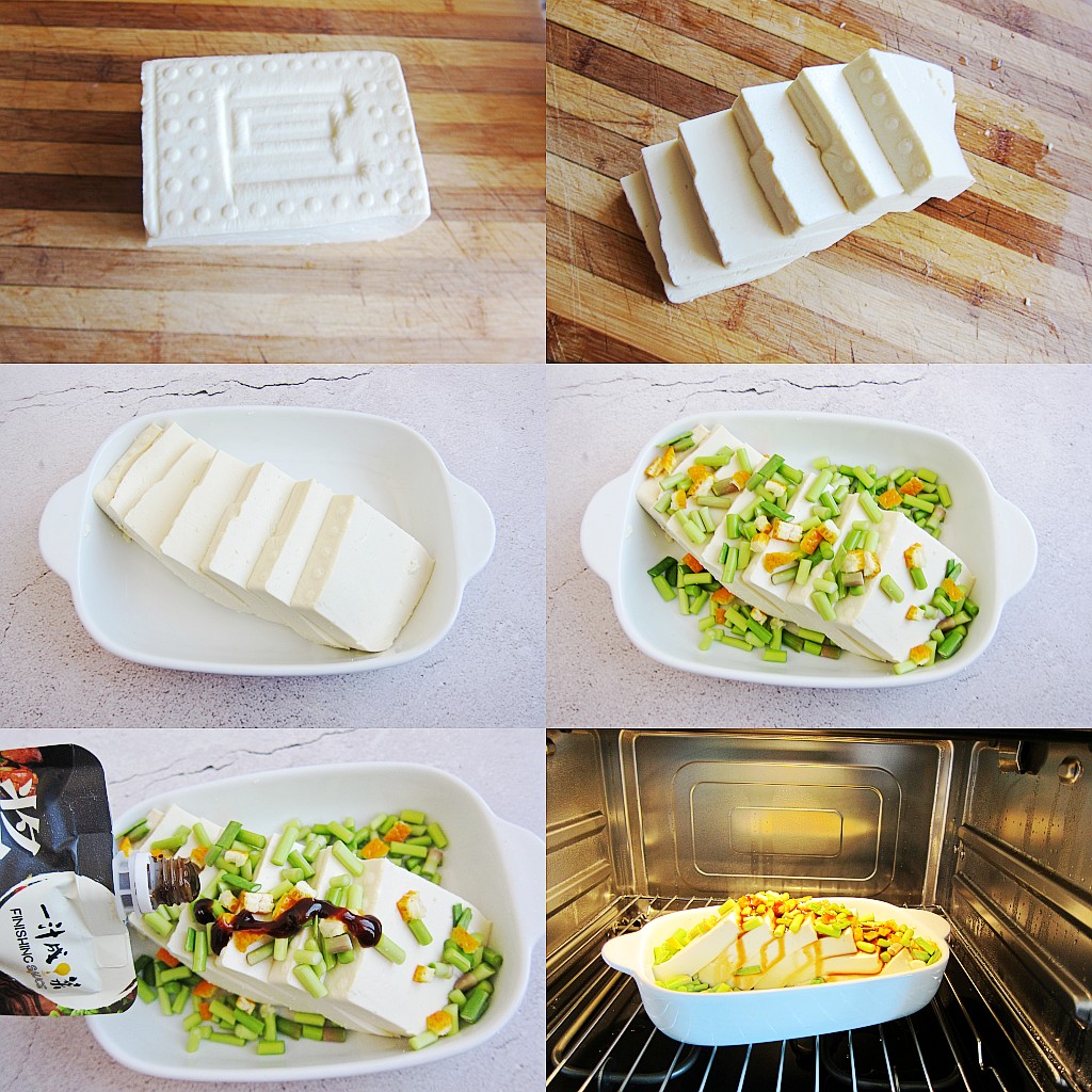 步骤;水豆腐清水冲洗一下,切成厚片,再将切好的豆腐片,摆放在烤盘里,撒上青蒜碎,浇上照烧酱汁和盐。再放进烤箱下层。接通电源,选择一键式烤菜模式更简单,做好后会有提示音。