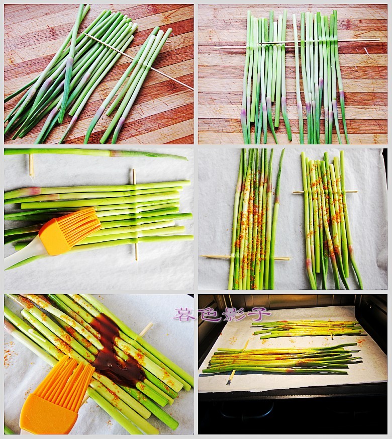 蒜薹上撒点辣味腌料。刷辣椒酱的量,按照个人的口味添加。