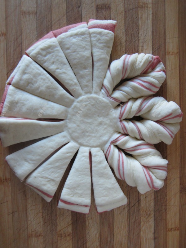用快刀切成均等的16份,向外卷起来,2个捏合在一起收起来。