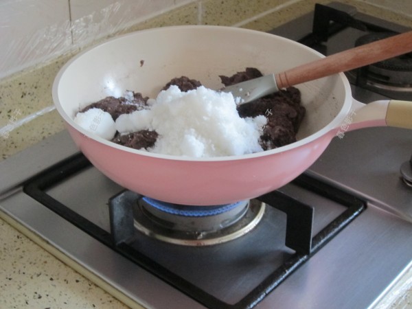 制作:高压锅煮的红豆,料理机打碎,放进陶瓷不沾锅内加白糖小火炒干即可。
