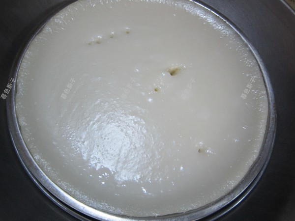 倒进一个抹油的不锈钢浅盘子里边,大火蒸变色,没有把握就用筷子戳戳,没有面浆就蒸熟了,取出来放冷再装进保鲜袋擀平。