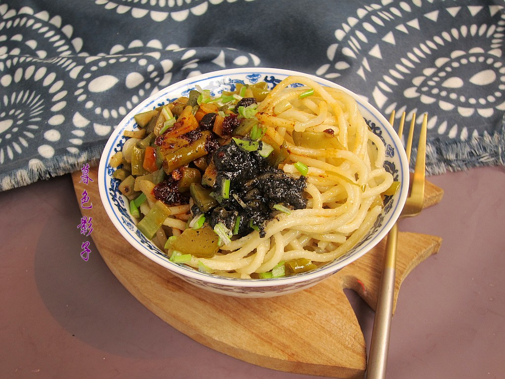 自家腌制的萝卜干,非常的有咬劲,口感清脆味道甜甜的超级爽,用冷冻的方法保存起来很不错。做热干面小菜必须有,切碎和下图的菜一起炒。植物油一勺炒小咸菜。一定要切碎了再炒。加点点的酱油调味就行了。炒好的小咸菜搭配热干面吃味道超级好,如果没有小咸菜买点榨菜之类的也可以。