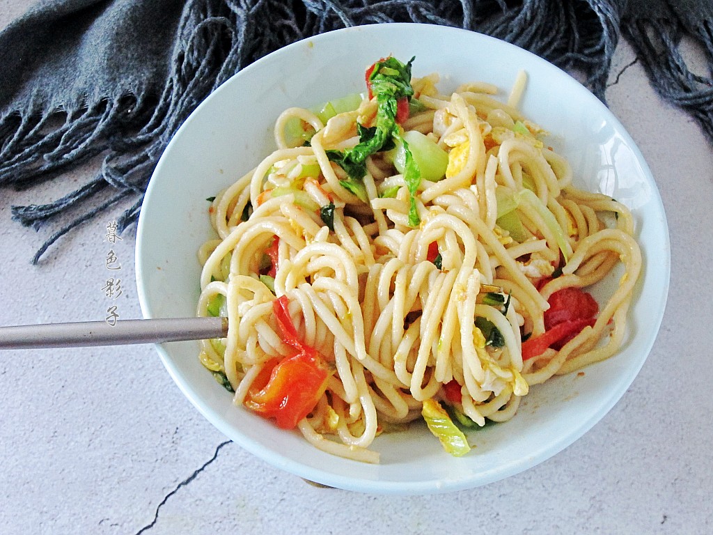 5,蔬菜炒蔫了,然后就把熟面条倒进锅内,不要开太大火,中火炒面就行了。