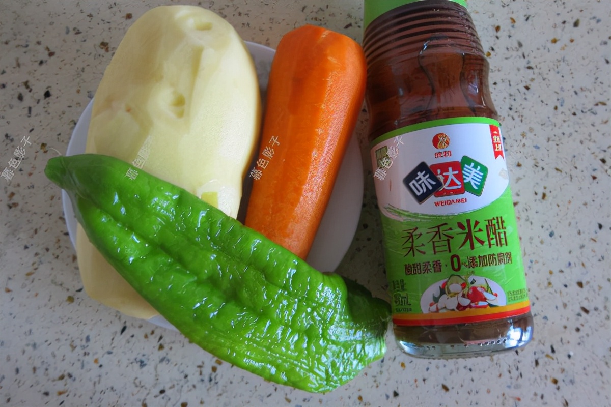 食材:黄心土豆1个,小青椒1个,胡萝卜半个,米醋2勺,植物油1勺,盐1勺。