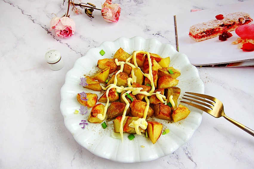 2,切成小块撒几滴植物油口感更好,晃动下烤盘,薯块均匀的沾满即可。
