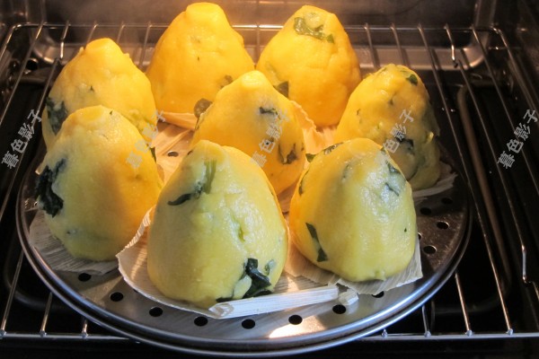 这些面一共做8个窝头,把窝头下边垫个草叶,然后放在笼屉上边。