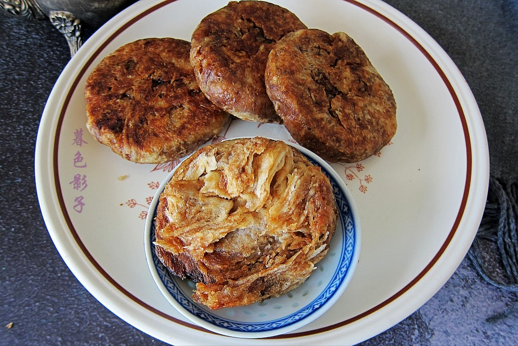 捏下面团的封口或者旋转一下,按扁就行了。热锅加植物油,小火慢烙,注意翻面,二面煎上色,翻饼的时候很酥脆掉渣。