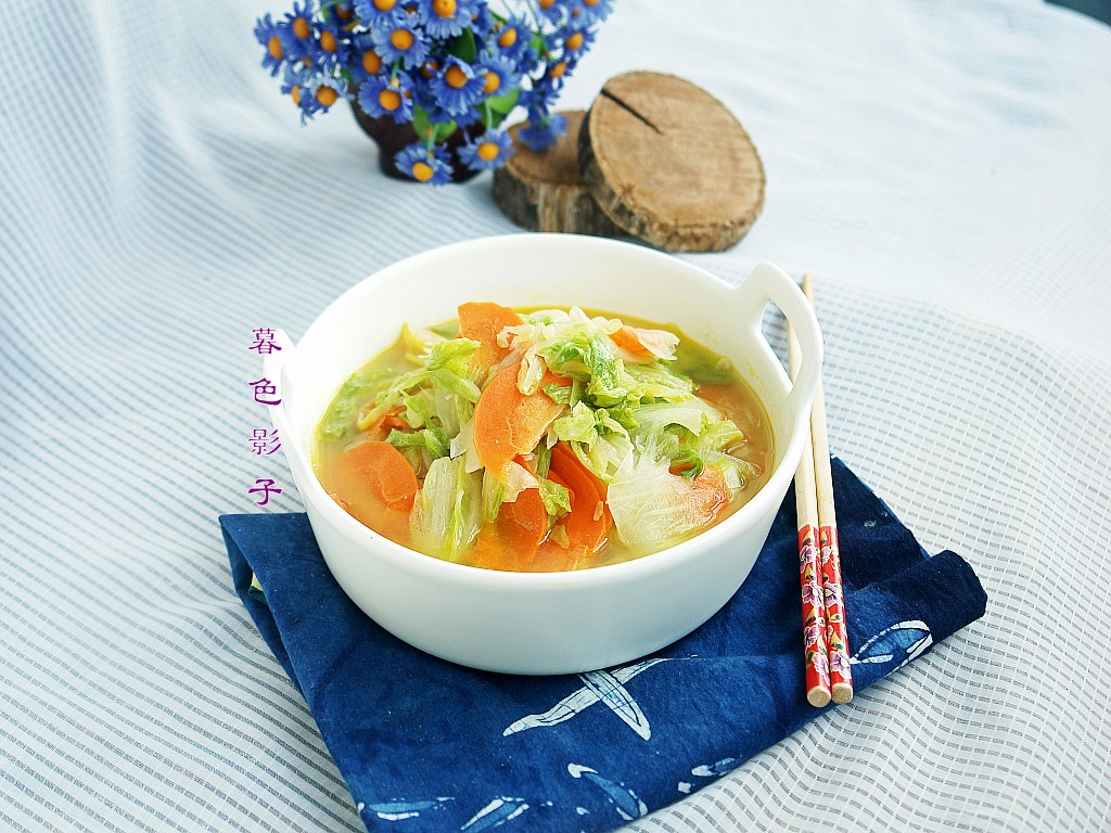 热油爆锅放葱花爆出香味,再炒胡萝卜片。胡萝卜炒软,放白菜一起翻炒。燃气开中火即可。
