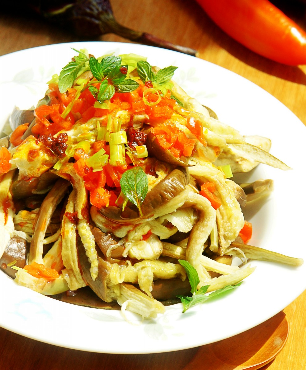 拌茄子的配料准备好了。辣椒和葱花切好。蒸好的茄子,手撕成条(用刀切的茄子不好吃,有铁锈味)开始拌菜了,把切好的辣椒和葱放撕好的茄子上边。