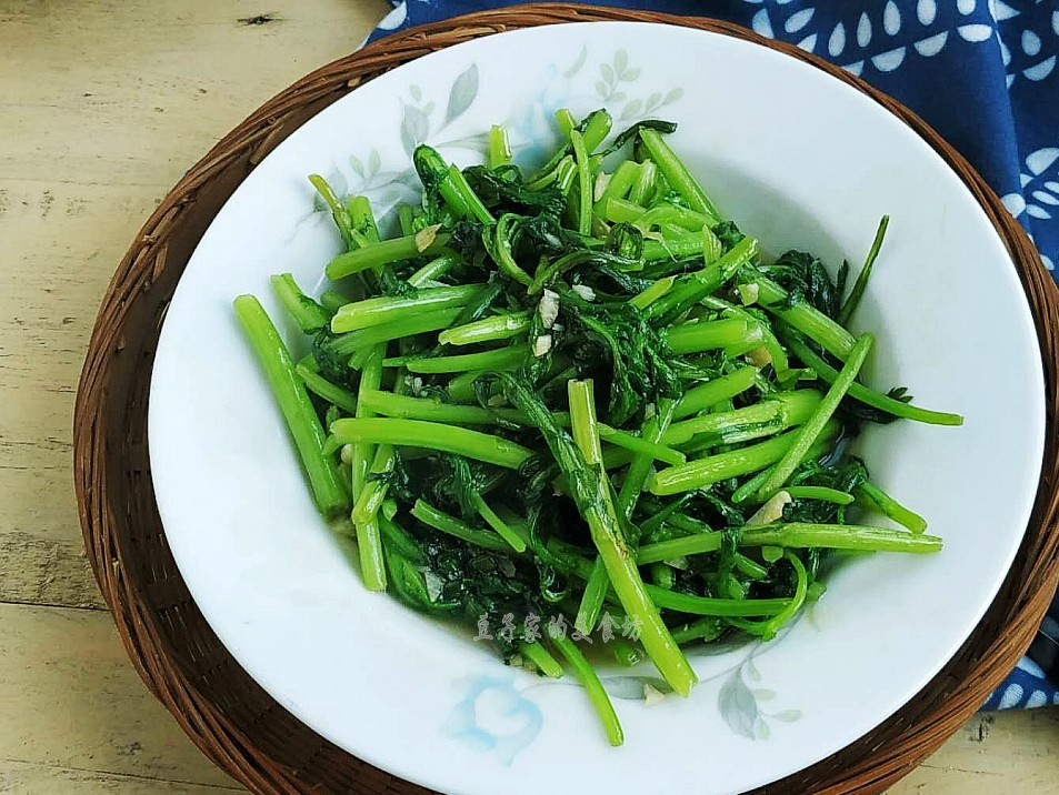 大蒜瓣爆锅,爆出香味,炒茼蒿。炒这菜要开大火炒菜,而且翻炒得也要快点,翻炒几次菜就会蔫了,把握好火候。出锅前再加适量切碎的蒜和盐翻炒出锅。