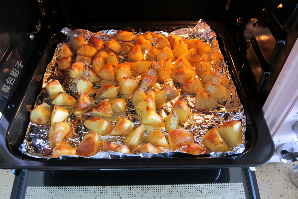 在土豆块上边,用小刷子刷点植物油,这样熟得快口感也更好。把烤盘放进烤箱的中层即可,设置烤箱上下火200度,时间30分钟。需要按照食材来确定时间。