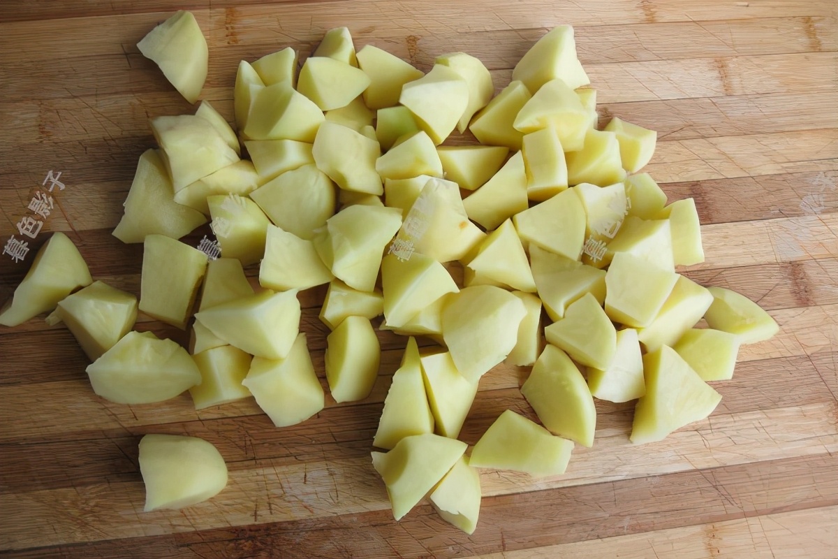 切好的土豆块用清水冲洗一下淀粉,加2勺盐腌制10分钟左右,土豆软了就行了。