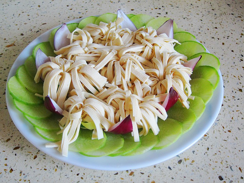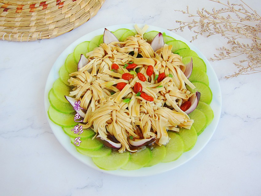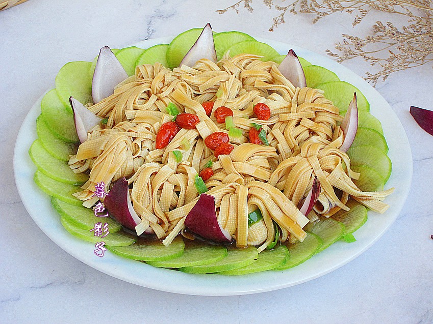 食材;干豆腐2张,水果萝卜一个,圆葱数量,六月鲜8克轻盐原汁酱油2勺,淀粉1勺。