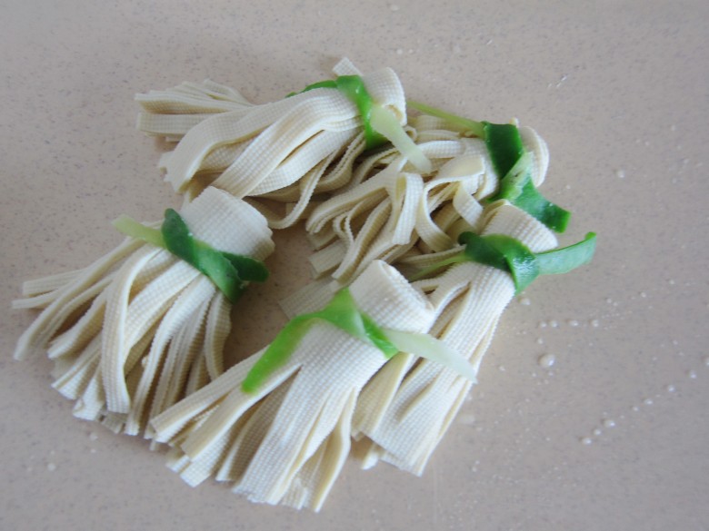 切好的干豆腐就卷起来,成为一个小捆子了,用萝卜皮系起来。