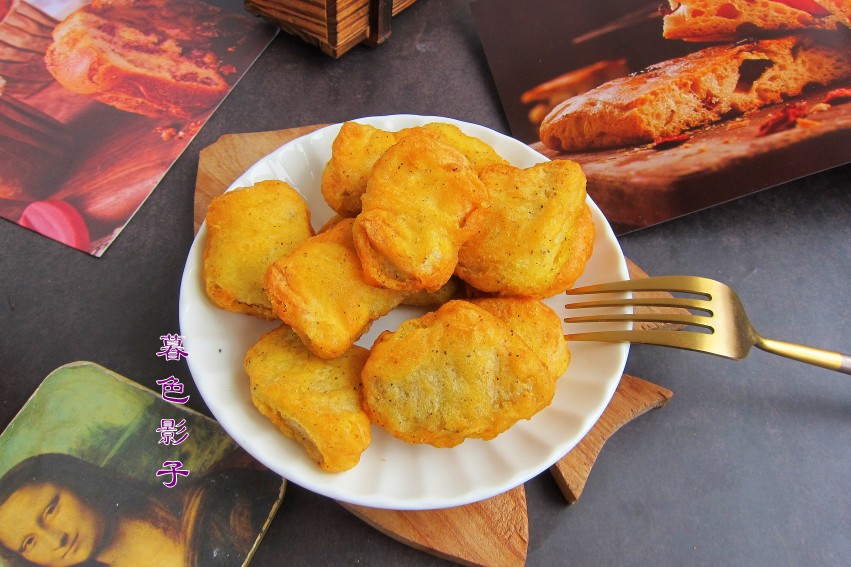 制作;冷冻的胡椒鸡块,直接装进铺油纸的空气炸烤箱烤盘,鸡块之间留有空隙。