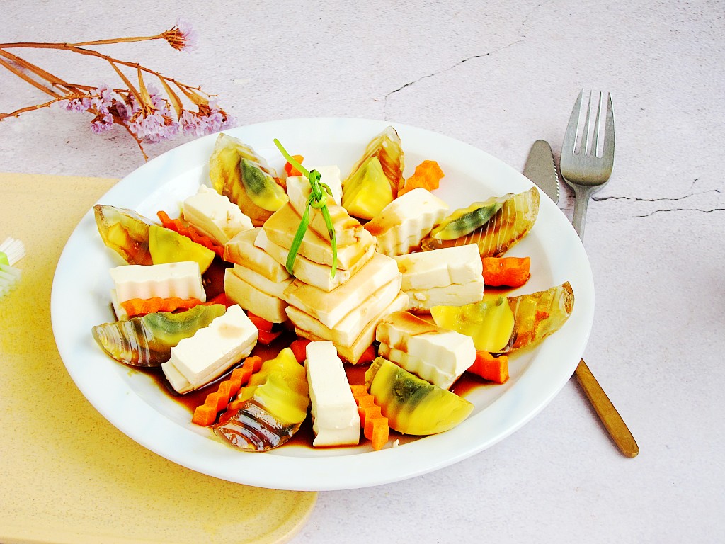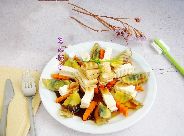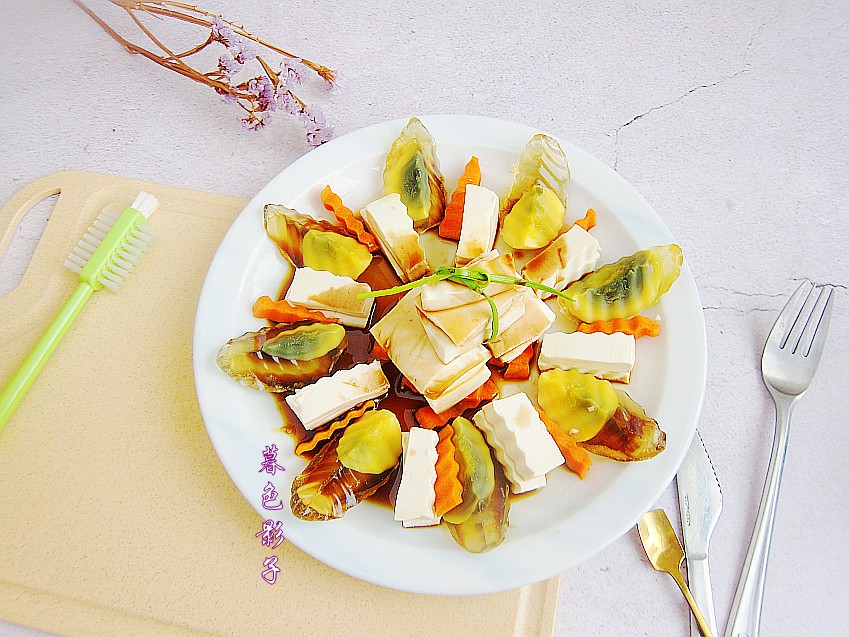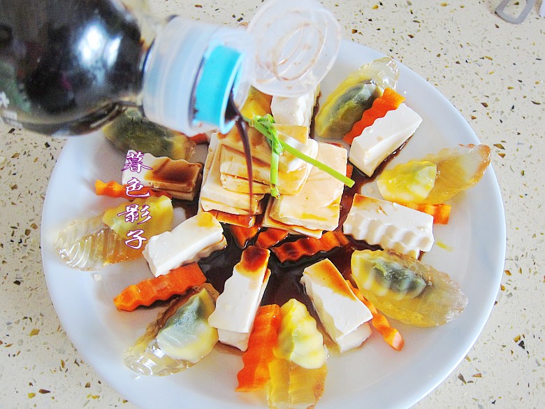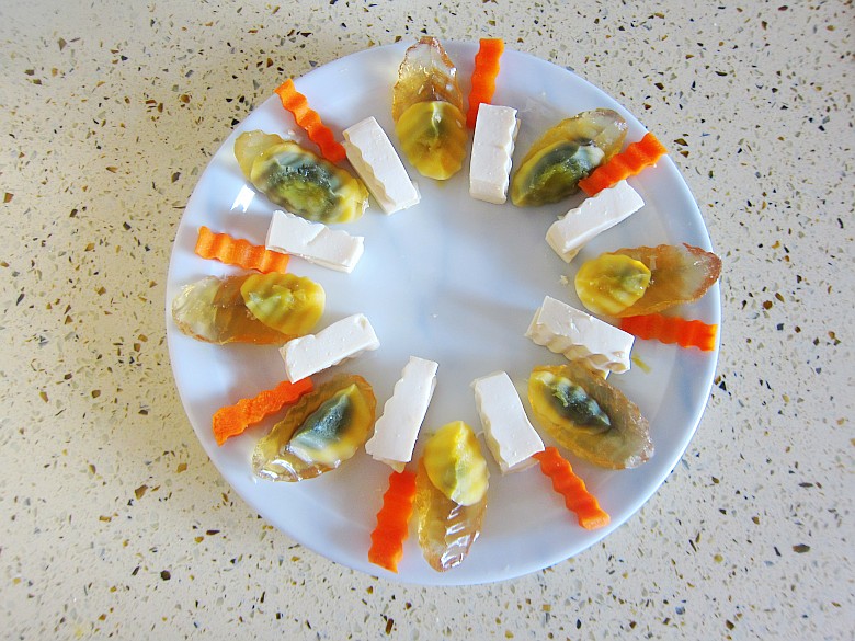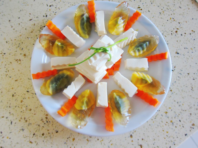 再把切好的皮蛋和豆腐块,胡萝卜条都按照自己喜欢的样式摆入盘子里,是不是很特有仪式感啊,好吃又好看。