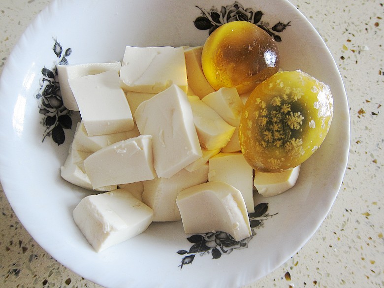 把豆腐切成块,皮蛋剥皮冲洗一下干净,也可以带皮煮一下再剥皮。