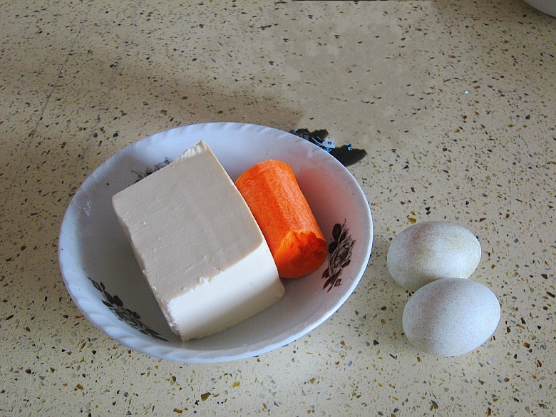 食材;水豆腐1块,皮蛋2个,胡萝卜半个,六月鲜8克轻盐原汁酱油2勺,口袋醋1包。