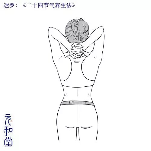 通关秘诀:双手十指交叉抓握放在后颈部位置去温暖它,然后手掌跟用力去夹揉它。夹住肌肉用力向外提捏,做10~20次,一直把颈部提捏到发红发热。