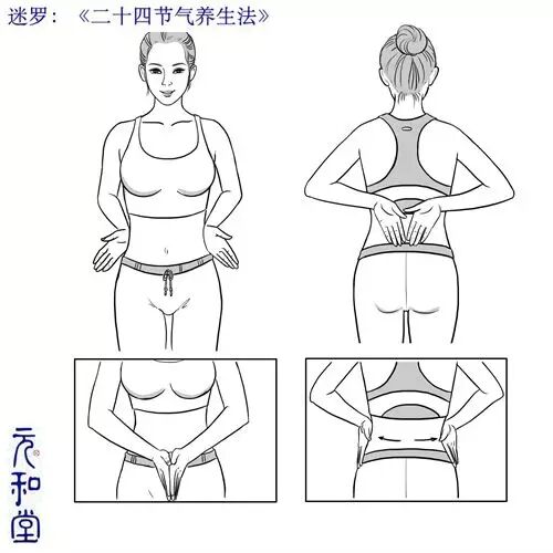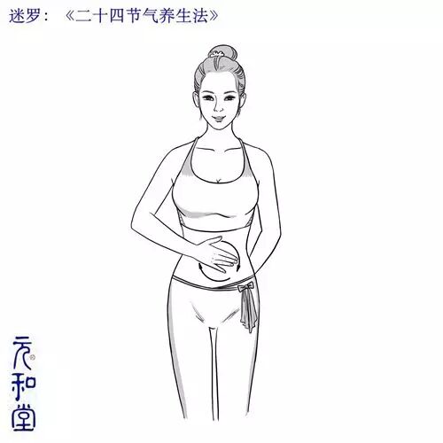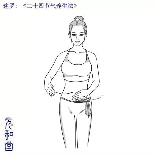 【步骤】:提升腹部的温度,先揉腹。两只手叠在一起放在肚脐上,以肚脐为中心,先逆时针揉动。力度一定注意不要太轻,尽量把腹部软组织带动起来,保持一定按压力;次数在二三十遍以上。再向顺时针方向揉动(逆为泄顺为补,欲补要先清)。