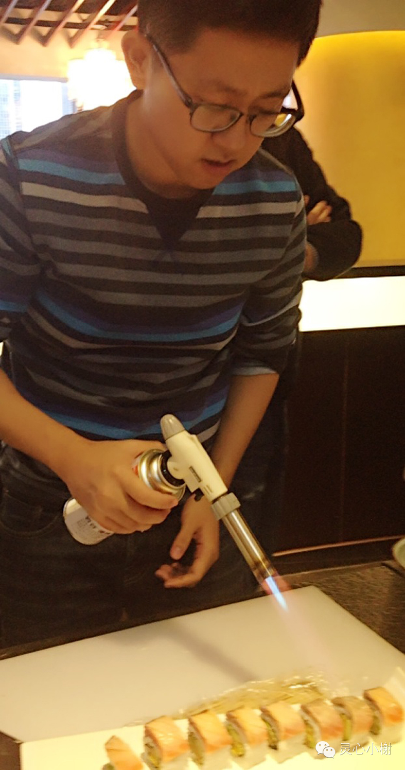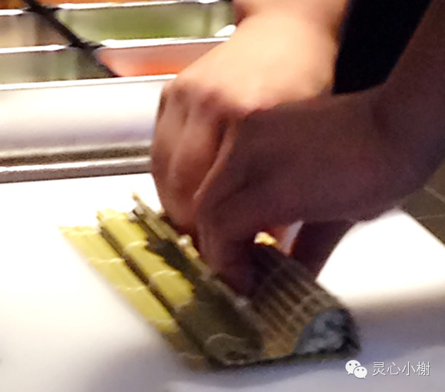 别看厨师长演示的简单,初学者真正做起来还真有点儿手忙脚乱,不是米饭黏的满手,就是把六块错切成了八块。我们组倒是平时没下过厨房的一位学习能力超强的男生进入了决赛。
