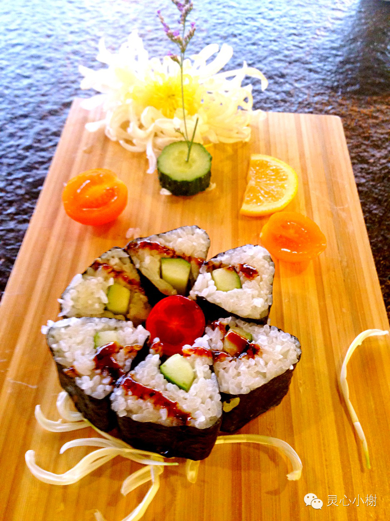 日前,参加《健康与营养》杂志与将太无二餐厅合作组织的寿司DlY体验活动。厨师长演示了名为“秋天的童话”的颜色缤纷、用料丰富的一款里卷和一款入门级的黄瓜细卷的做法。
