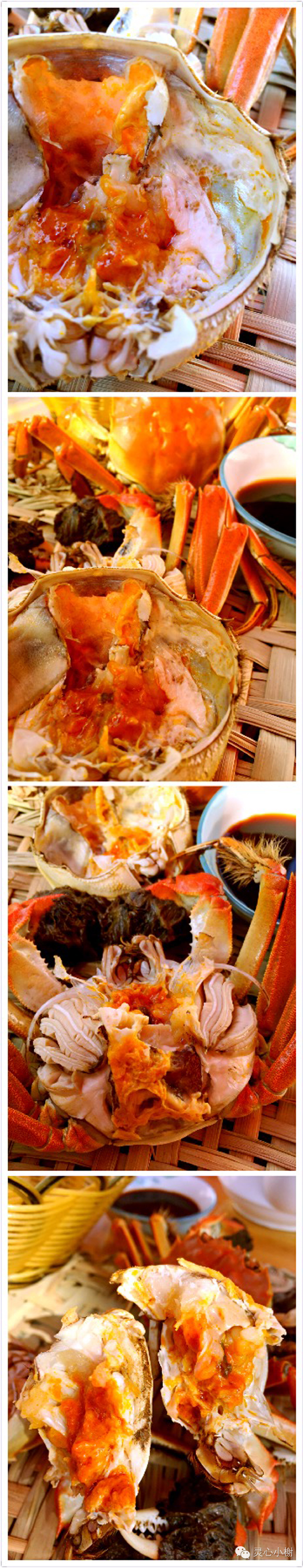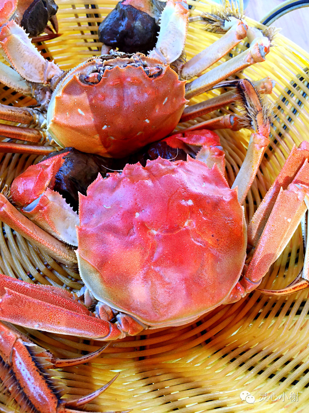 张叔教我如何区别真正的阳澄湖蟹和塘蟹。阳澄湖水质清,河床平展,所养出的大闸蟹常年以小鱼、小虾、蚌为食,肚白、背壳特别青亮,黄毛、金爪、体壮、肉满、肉质细嫩、膏黄很足,制熟后的背壳颜色发红亮,味道十分鲜美。塘蟹的腹部麻点多、发灰,没有阳澄湖蟹洁净,蒸出来的背壳颜色发橙黄,有点儿灰暗,肉质和膏黄不是那么满,吃起来鲜美程度也不足,会隐隐有点儿土腥味。看一看外观对比的图片,还是比较明显的。