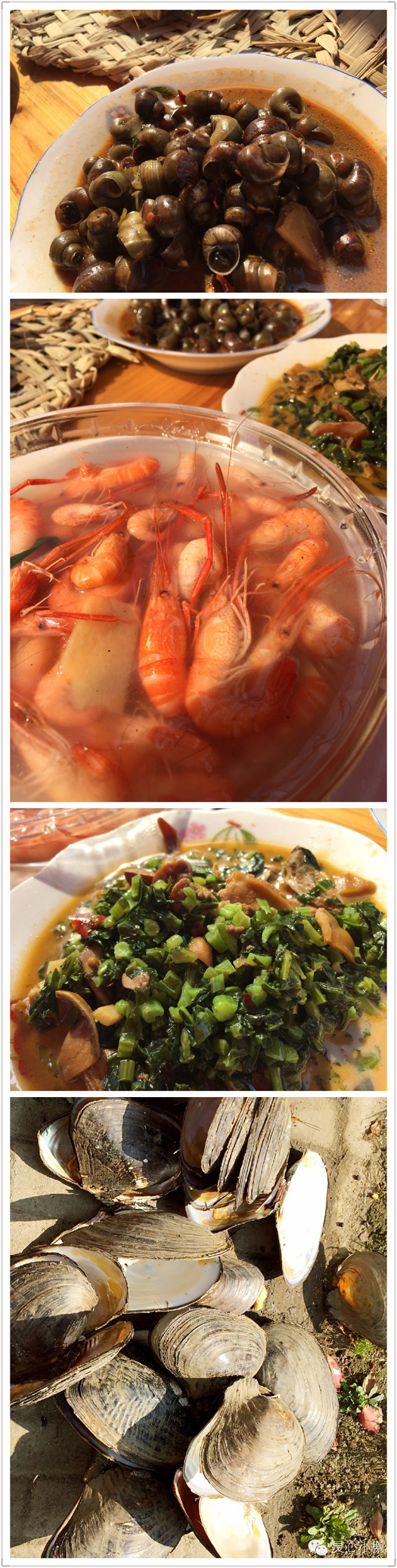 在杨叔家开的农家乐,品尝了莲花岛上的农家菜。酒酿螺蛳,雪菜炒湖蚌,清水煮湖虾,咸鸭蛋,南瓜粥,当然少不了自家刚捞上来的大闸蟹。如果是自己吃,莲花岛渔家习惯用清水煮蟹,待客时,才用粗棉绳扎了蟹足,上笼蒸食。真是鲜美啊!