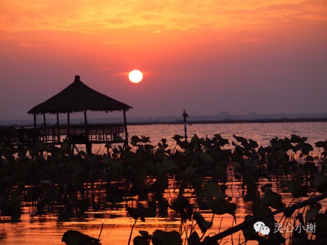 清晨,莲花岛上的晨曦特别的宁静、清新,一切看上去是那么清澈,太阳升起来的时候,映红了天空与湖水,金波潋滟,让我这看惯了喧嚣嘈杂都市的人,心神沉醉。