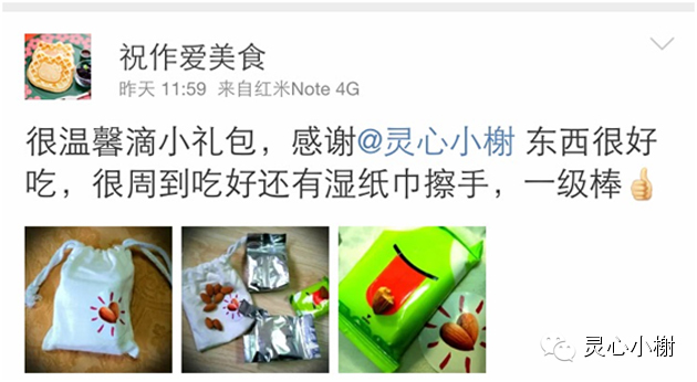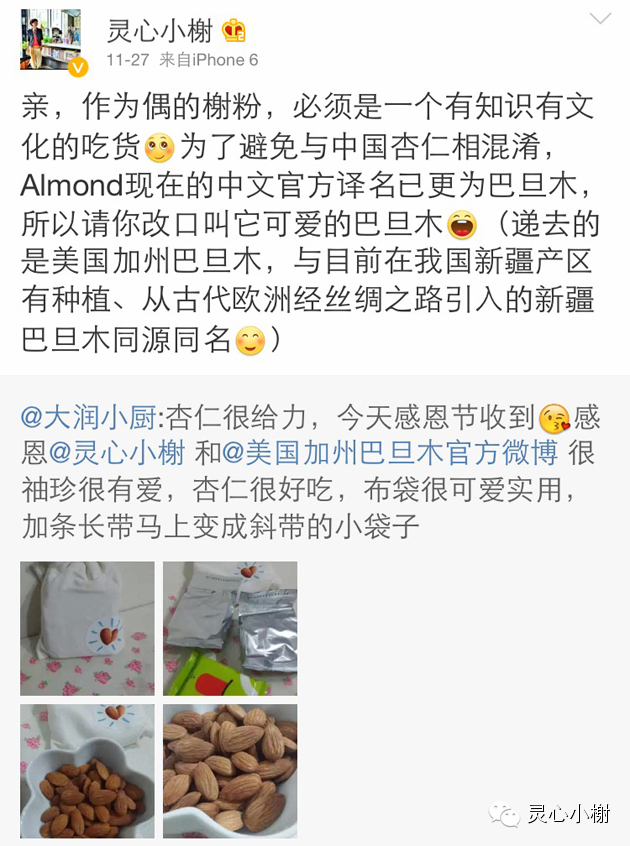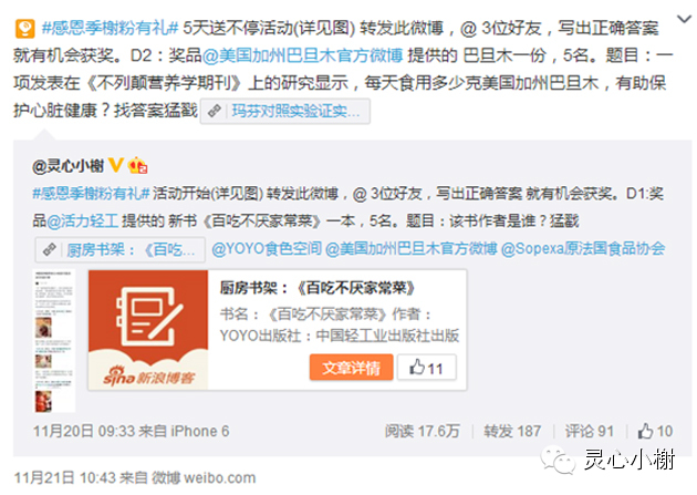 那两天真的很忙乎,上午十点多才发出题目,次日凌晨2点多才公布当日的获奖名单,题目答案是30克。当日的奖品是美国加州巴旦木小礼包一份。