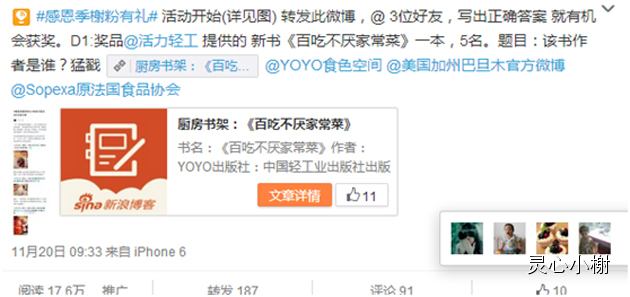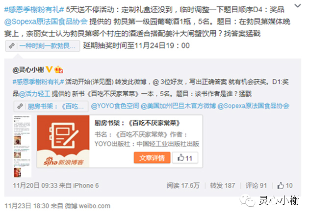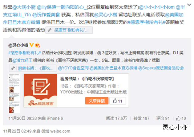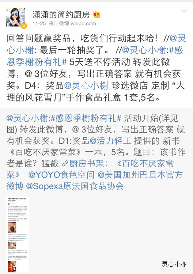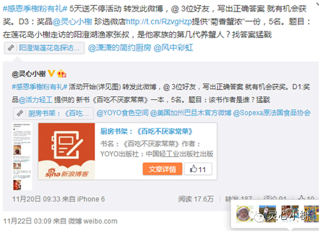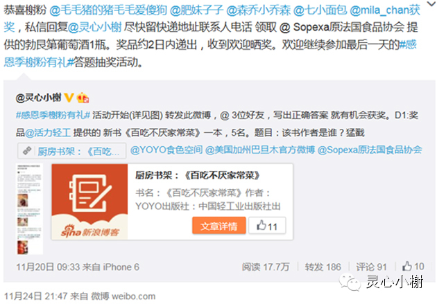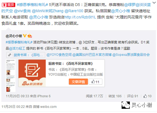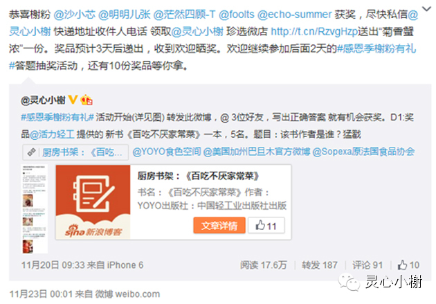 11月20—26日忙活了7天的感恩节前#感恩季榭粉有礼#粉丝小活动结束了,5种“榭礼”已陆续收到、在路上和即将寄出。活动通知微博的阅读量达到了17.8万次。对于一个我个人操作的小活动还算不错吧,呵呵,赞一下