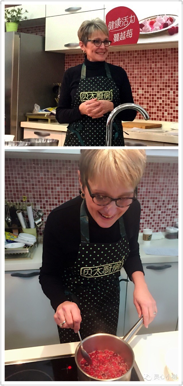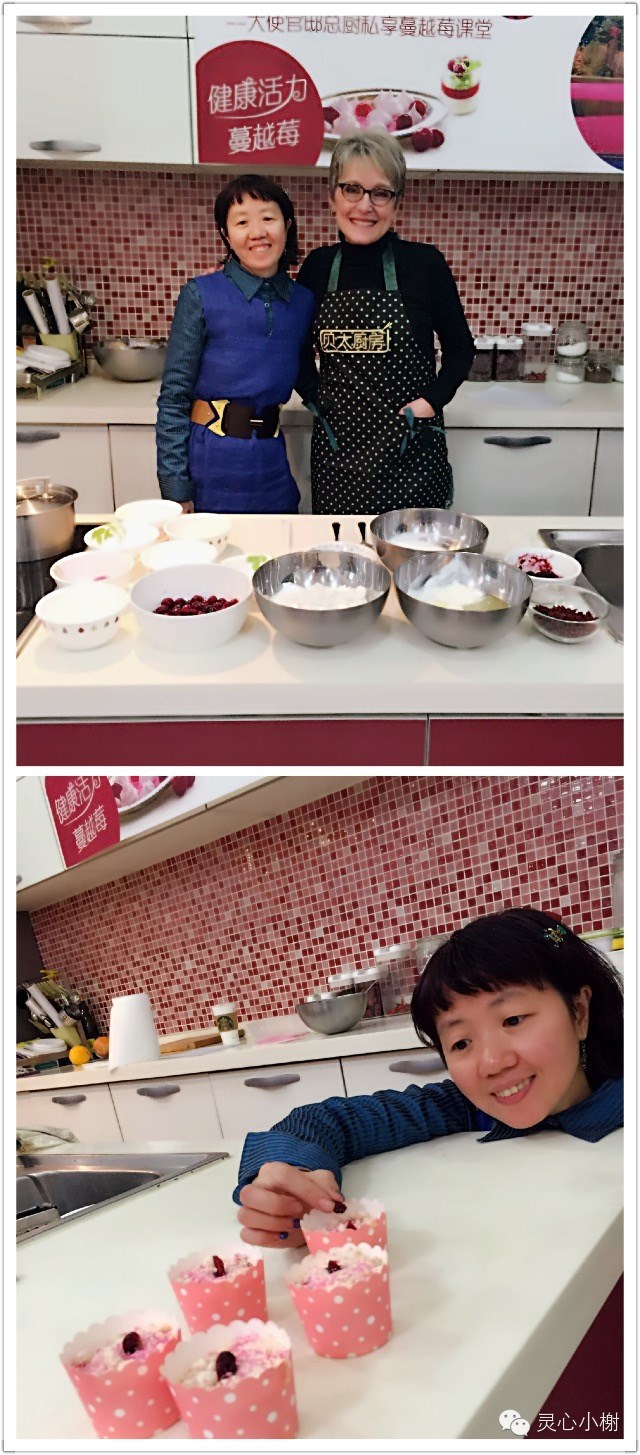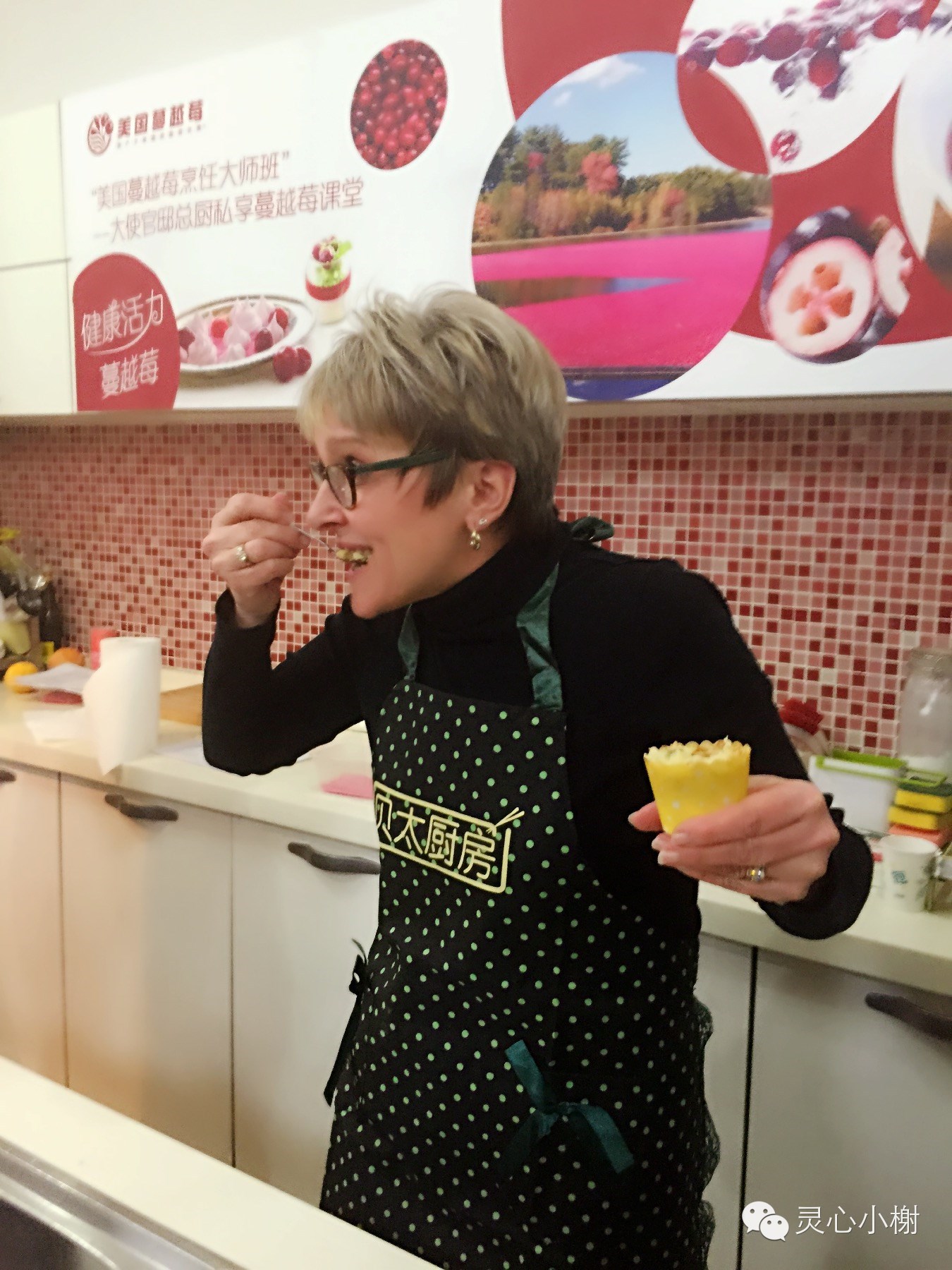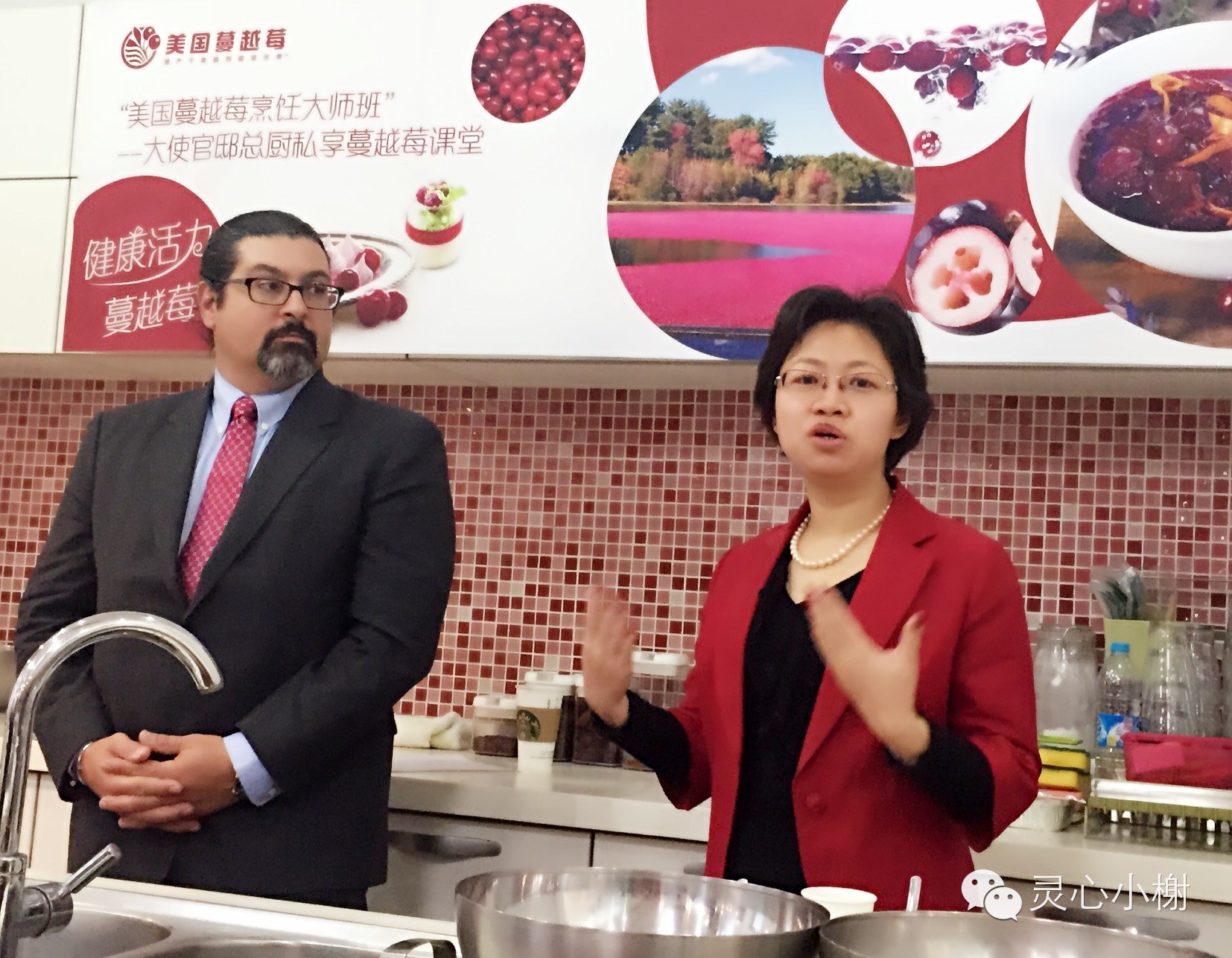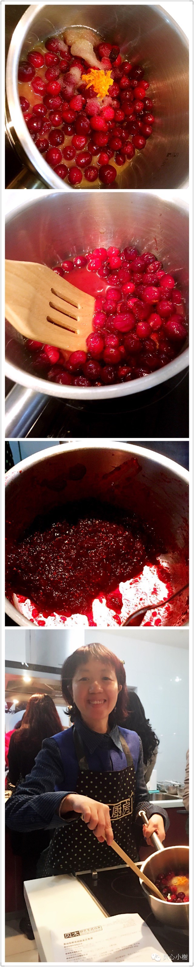 然后,大使夫人开始教大家做一款在美国菜肴中非常常用到的蔓越莓酱的做法。可以做咸味酱,配火鸡、烤肉;可以做甜酱,放在蛋糕里或抹在面包上。