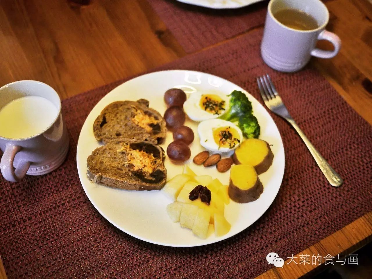 每一种单品介绍完了,那么我们来情景重现一下吧,今天早上6:20,我揉着眼睛从床上爬起来,打着哈欠走进厨房,按下煮蛋器的开关,拧开煤气炉加热蒸锅和烧开水,然后洗漱,洗漱完毕鸡蛋已煮好,取出放入凉水中,红薯也已经热透,换锅放少量水加油加盐煮西兰花,同时切水果、切面包、剥鸡蛋(鸡蛋对切再撒了些拌饭用的海苔碎调味)......6:40,我已经坐在餐桌边面对一桌丰盛的早餐了,这时候可以有音乐也可以看会儿新闻,困意不再、神清气爽。