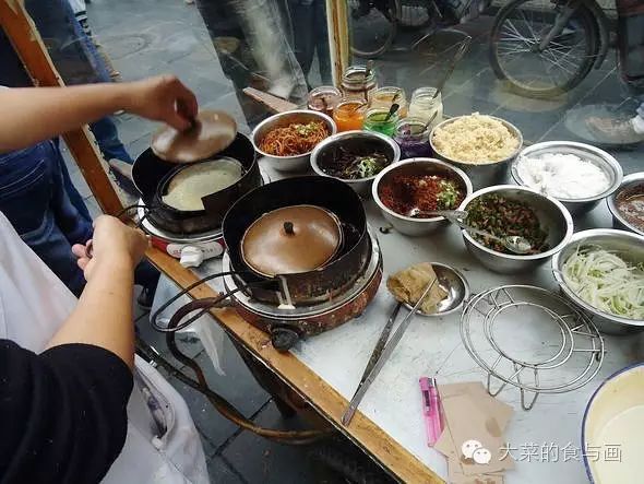那时候蛋烘糕就是所有街头小吃的至尊,因为有鸡蛋显得很洋气,又是热气腾腾地现场制做,吃在嘴里外焦里嫩甜甜蜜蜜,我曾经觉得最好吃的东西莫过于此了(请我爱的糖油果子、三大炮、艾蒿馍馍不要生气,我对你们的爱也是不变的......)。有时候没钱买,我也会在现场看师傅手脚麻利地制作,两个紫铜小锅来回换着:浇面糊、盖锅盖、撒芝麻白糖馅儿、再盖锅盖、最后对折,最后还要在蜂窝煤炉子上烘一下才算出锅,除了甜的也可以放大头菜、跑豇豆等咸的馅儿。卖蛋烘糕的师傅一边做蛋烘糕一边收钱,还要时不时地呵斥周围的一帮孩子让开点,不要挤,但手底下的两只紫铜小锅从不会乱,我一边咽口水一边欣赏那每一个步骤,心想啥时候可以吃够这美味啊!