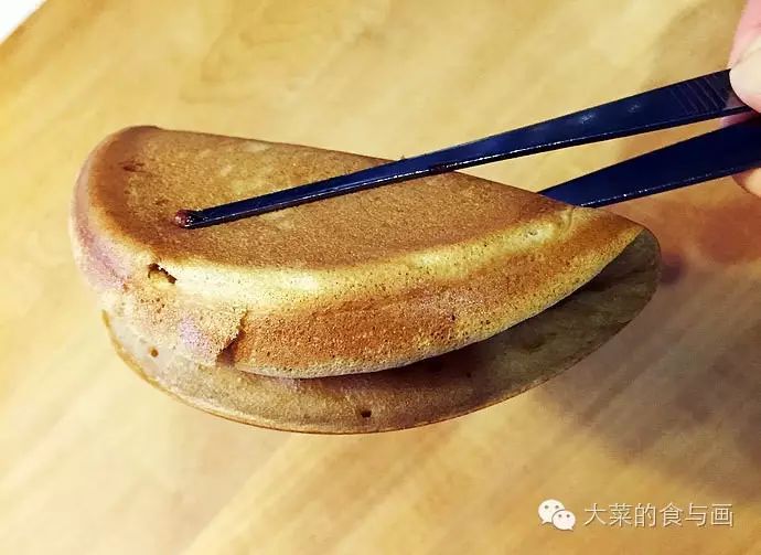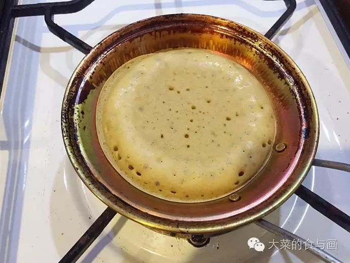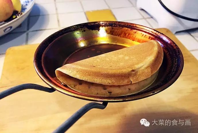 蛋烘糕特质的铜锅底面是中间鼓四周凹,而且还配了锅盖,这样面糊放入后中间先熟四周后熟,放入馅料以后对折刚好可以粘合,另外,紫铜锅表面光滑、传热快,可以让做出的蛋烘糕外皮呈现漂亮均匀地焦糊色。