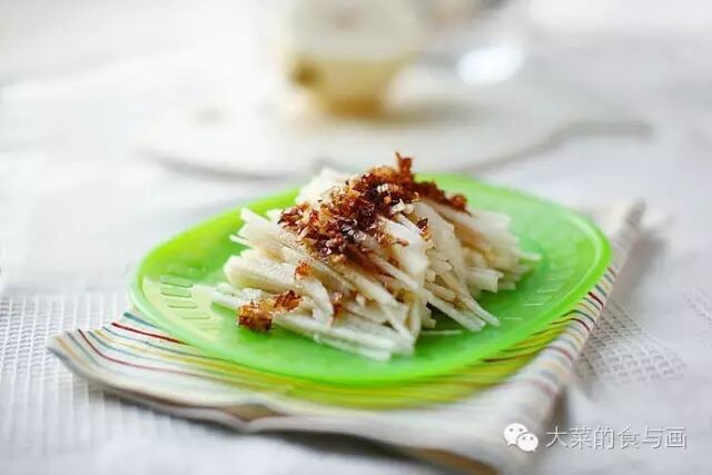 1、将雪花梨去皮去核,切成细丝,放入盘中。