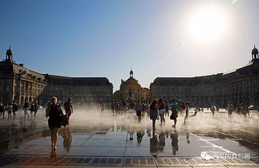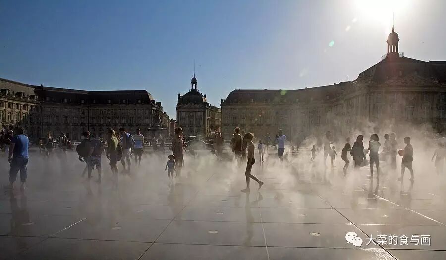 水镜广场位于加伦河边,建于2006年,占地3450平方米,是波尔多一处独特的景观,广场上有很多喷水孔,但并不像一般的喷泉般以喷水花式为单一吸引点,而是每15分钟便会按照程序,幻化出不同形态超多变的花式,人们可以走进广场嬉戏,同时,广场上薄薄的一层积水把波尔多的古老景色映入水面,以借景手法将新旧建筑自然融合。