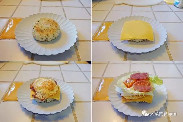 “玩”汉堡游戏开始,因为没有面包,所以用了剩的米饭做成饭团代替面包。
