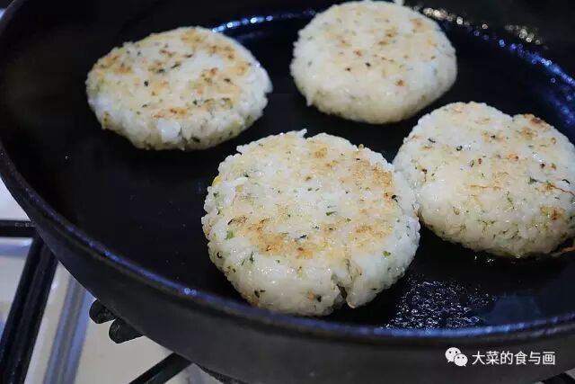 然后用少量油将米饭团煎成两面金黄,同时可以煎鸡蛋,夹在“汉堡”中间用。