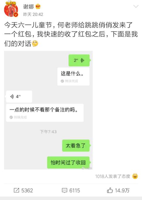 谢娜和张杰非常的宠爱孩子,今年是跳跳俏俏的第一个儿童节。干爸爸何炅当然不会忘记红包了。谢娜还把跟何炅的聊天记录给发了出来。一看到何老师给自己发了个红包,谢娜想都没想就手疾眼快点了红包收钱。收完钱才想起来问问何老师这是什么钱。