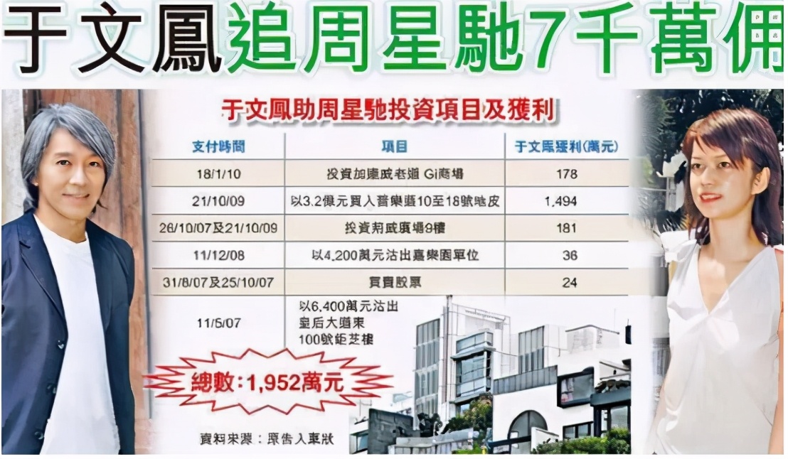 周星驰在和于文凤恋爱时,曾将手中所有资产交给于文凤打理。而于文凤手段高超,让周星驰的资产大幅增值,周星驰曾说过会将投资获利的10%作为分成送给于文凤。2010年两人分手后,于文凤多次讨要其投资获利分成,加起来一共7千万左右,但周星驰始终没有履行。