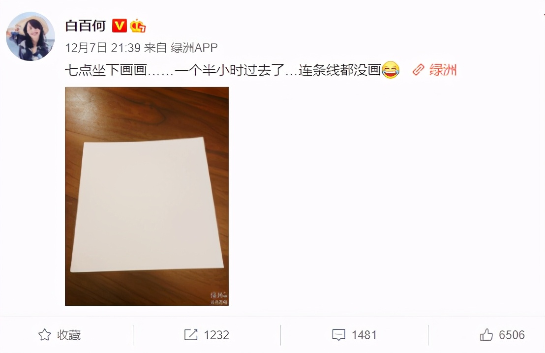 12月7日,白百何在社交平台晒出一张白纸,配文表示自己一个半小时什么都没画出来。“七点坐下画画……一个半小时过去了…连条线都没画”。粉丝评论调侃:“大师:人生就像一张白纸”。也有网友说,这次白百何“出轨事件”的首次发声,暗示自己像白纸一样清白。【本账号内容全部为落雪原创,禁止人渣们抄袭,违者必举报追责!】