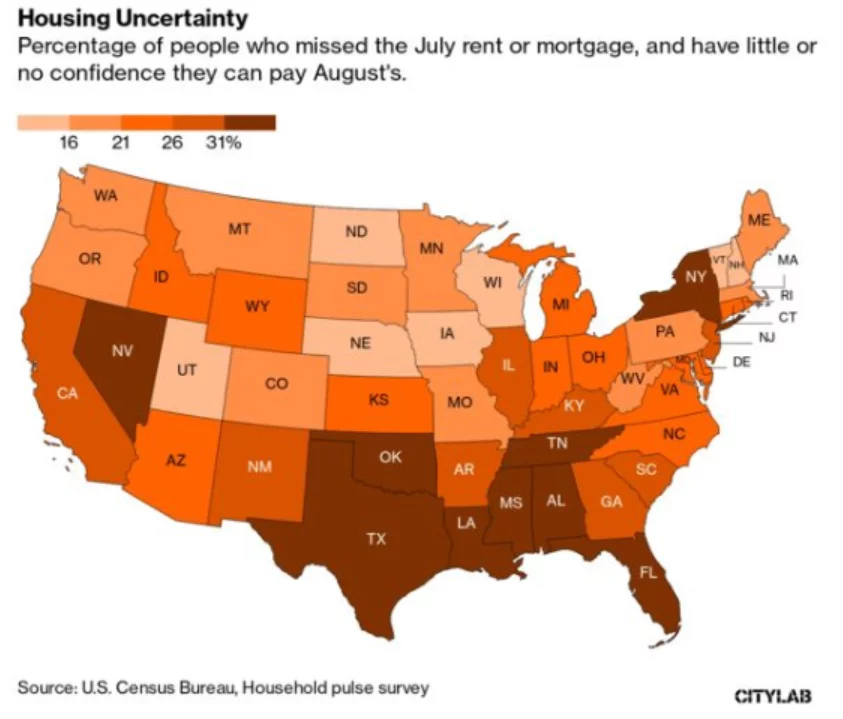 美国各州租房者对支付8月房租的信心不足(图片来源:city lab)