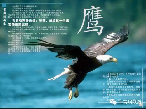 “鹰一生的年龄可达70岁,但要活那么长,它在40岁时必须做出困难却重要的决定,就是用150天左右的时间经历一场痛苦的蜕变,打脱自己的喙,拔掉老化的趾甲,当新的趾甲长出来后,再用新的趾甲把身上的羽毛一根一根拔掉。当新的羽毛长出,鹰重新开始飞翔。